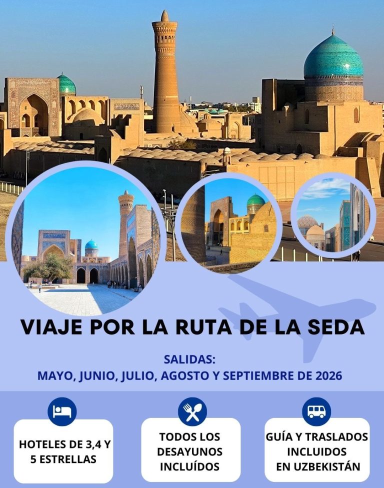 Además, disfruta de la rica gastronomía uzbeka, donde los aromas del plov, el shashlik y el pan recién horneado te conquistarán, y descubre la calidez de un pueblo que recibe a cada viajero como a un amigo.